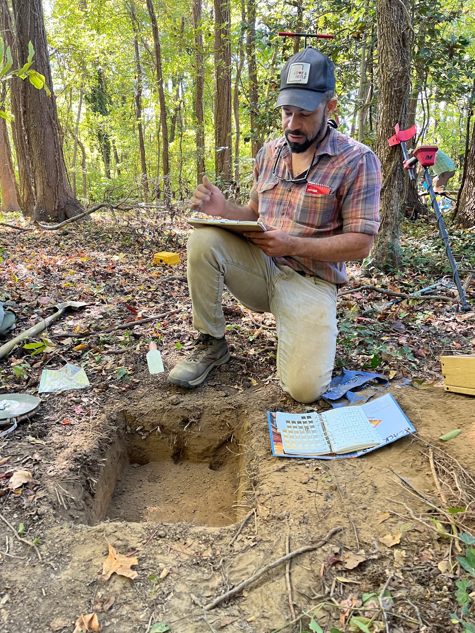 Our second test pit turns up another quartz flake. Roberts is giddy.