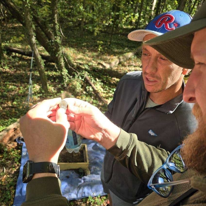 The metal detector chirps not two minutes into our search. Stutz and I exchange a look of heightened anticipation. Roberts sets down his tools. I rake the spot clean, and we begin to dig...