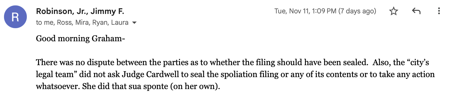 “There was no dispute between the parties as to whether the filing should have been sealed,” Robinson said in a Nov. 11 email to The Richmonder. “Also, the ‘city’s legal team’ did not ask Judge Cardwell to seal the spoliation filing or any of its contents or to take any action whatsoever. She did that sua sponte (on her own).”