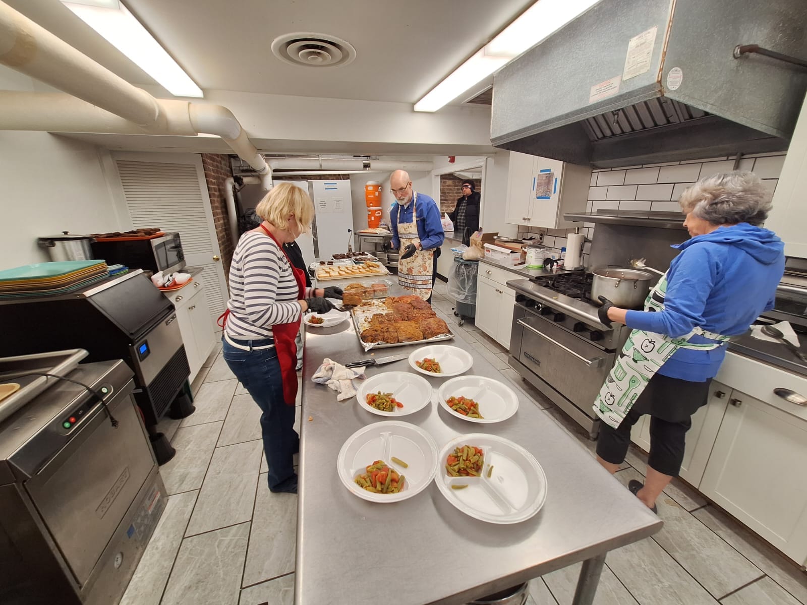 Inside the church, however, the atmosphere changes. The silence of the outside world gives way to the clatter of ladles, the clang of pots, and the aroma of hot food filling the air. Volunteers move with practiced ease, guided by routines honed over time.
