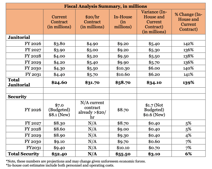 If the Council wants to ensure the workers get $20 an hour, the administration wrote, it should do so by adding wage provisions to existing contracts. That too would raise costs for the city, according to the report, adding more than $1 million annually to both the security and janitorial contracts.