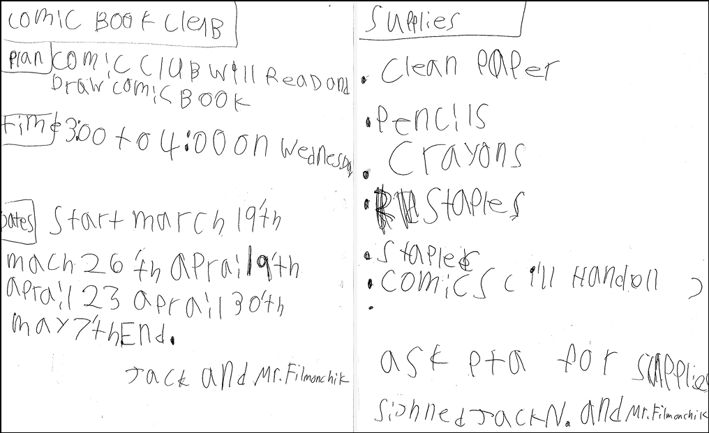 He soon got to work, with the support of Mr. Filmonchik, a first grade teacher. In his proposal, he wrote that the club will meet on Wednesdays from 3 p.m. to 4 p.m., starting on March 19 this year, and require supplies like paper, pencils, crayons, and staples, before signing his name at the bottom. It was approved by the PTA soon after.