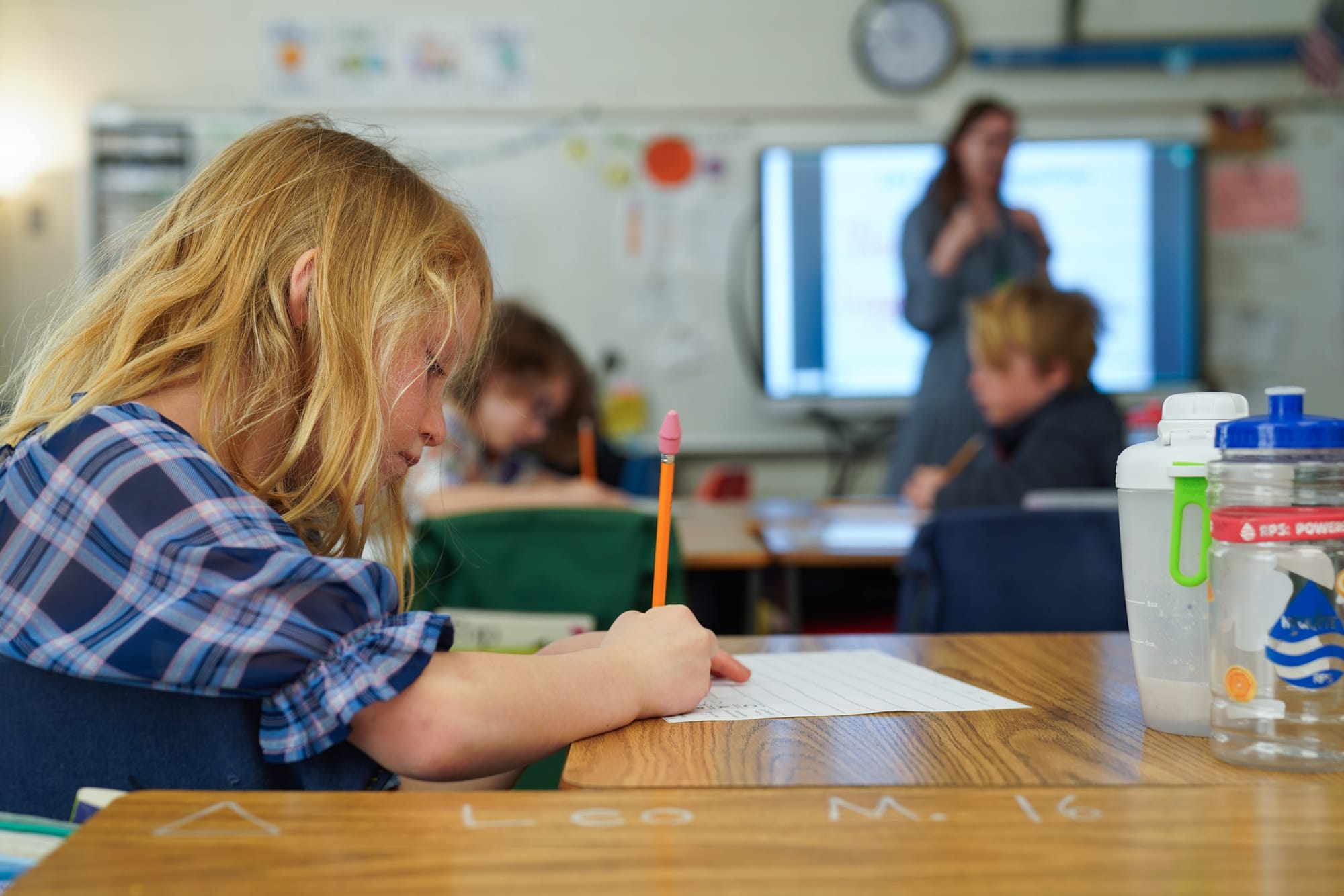 “I want you to turn your buh, into an mmm,” the teacher tells the students, as they write on their dry erase boards and in notebooks. “Read your new word in three, two, one.”