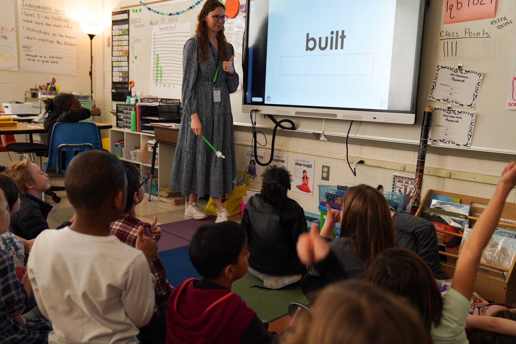 On a Tuesday morning in late March, Amira Boland is teaching her second grade class of about 20 students at Lois Harrison-Jones Elementary phonics – specifically, how to add suffixes “er” and “est” to the end of words with one vowel and ending with a consonant. The word on the board is “bad.”