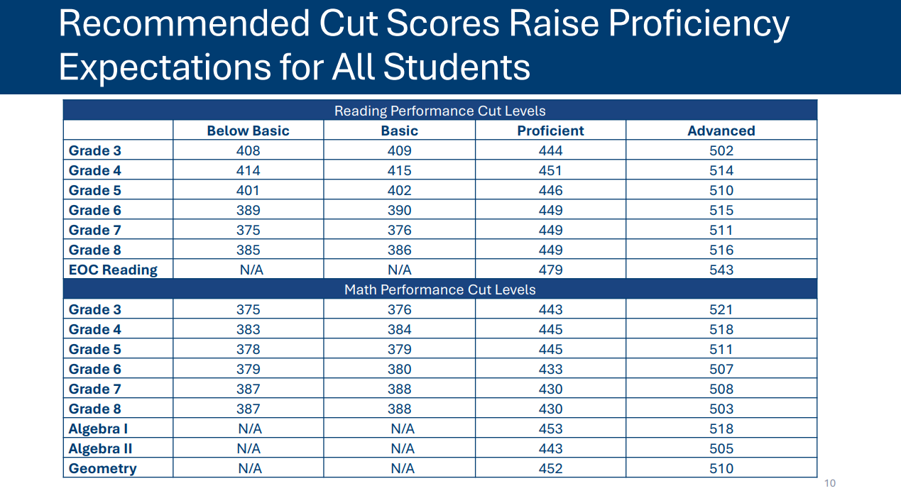 Katie Ricard (2nd District) also raised the issue during a joint meeting between state legislators and the School Board. She said the new cut scores will be “a huge leap for our students.”