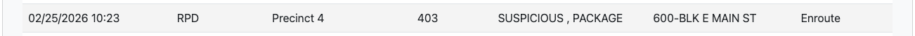 The RPD Active Calls log notes that officers responded to a call about a “suspicious package” in the 600 block of East Main Street at 10:23 a.m. this morning.