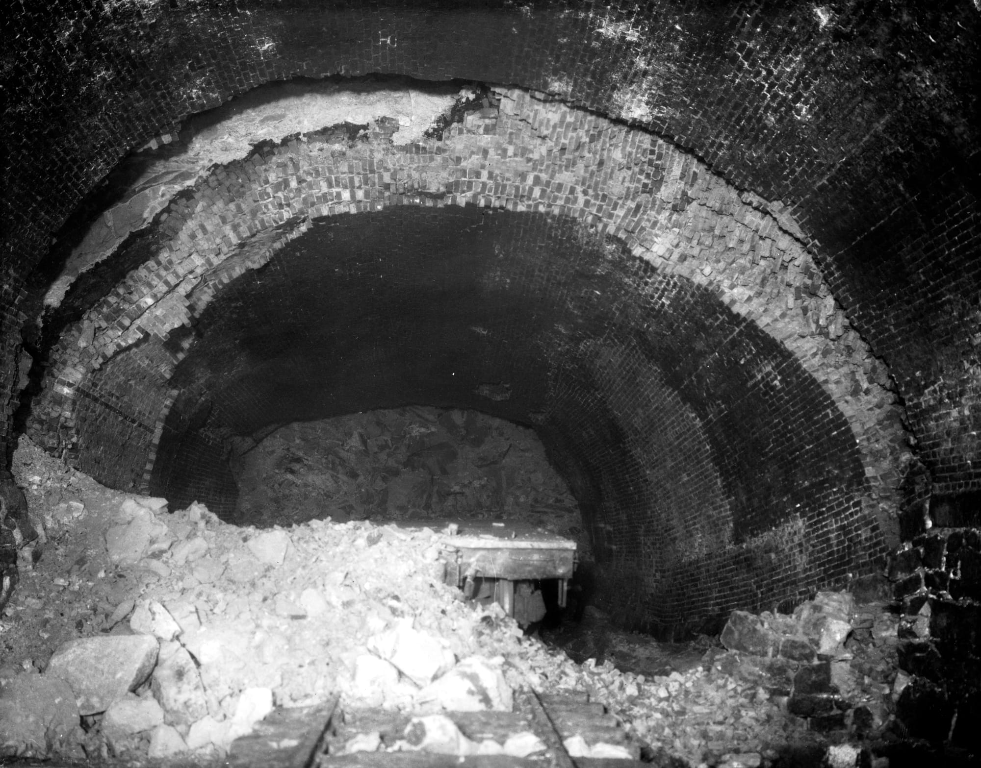 “A few bricks in the roof fell with a splash into the pools of water which spotted the earthen floor,” the paper continued. “The bulbs on the line of electric lights flashed twice. There were yells to run clear of the threatening cave-in and the workmen dashed along the track, a few toward the adjacent western end, but the majority into the dark pit which led to the eastern exit. Then came the crash of cracking timbers and the roar of falling earth and broken masonry.”