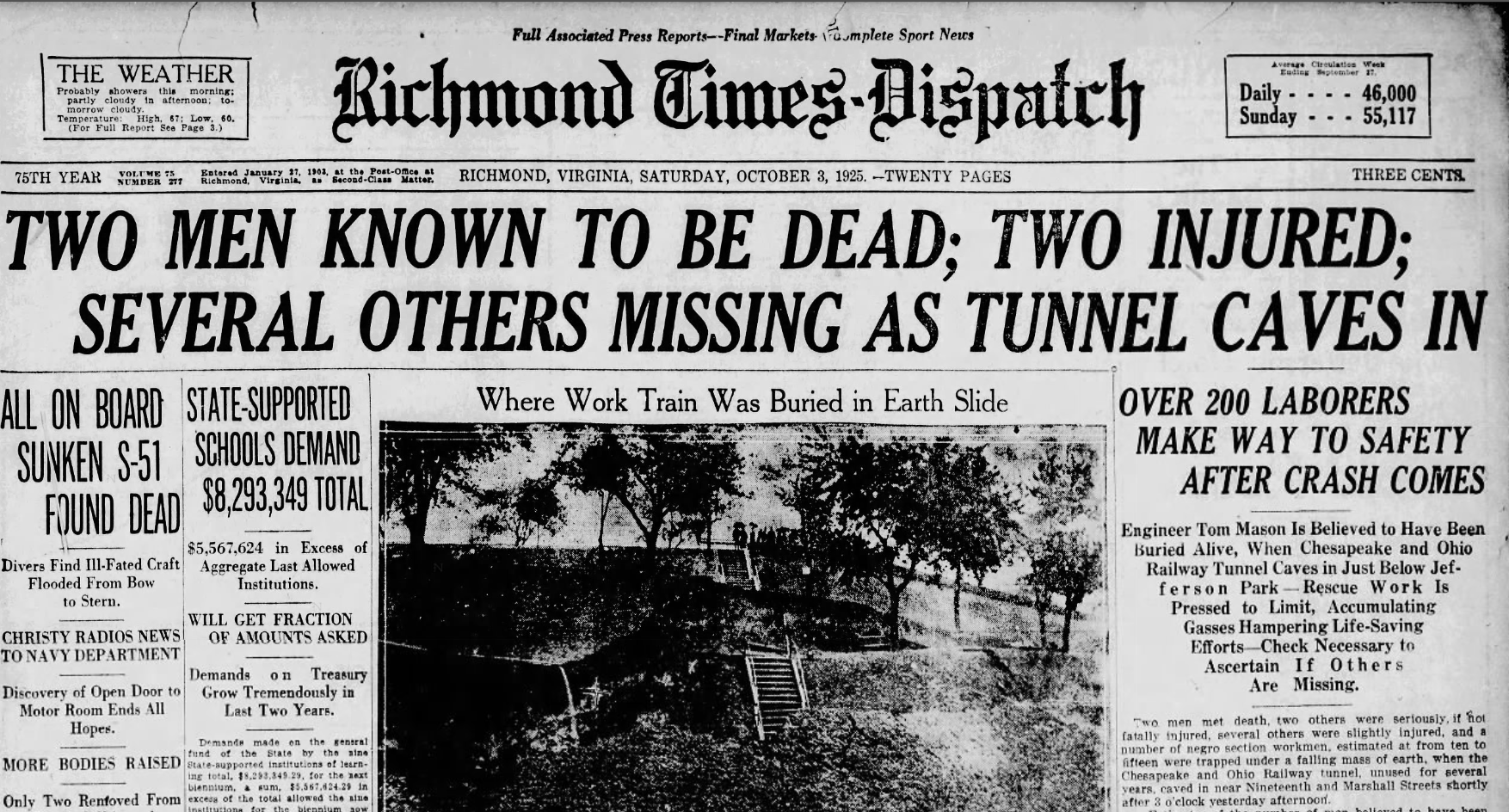 Whatever the cause, “just before the crash the masonry in the tunnel gave an ominous warning of the catastrophe impending,” wrote the Richmond Times-Dispatch in a front-page account of the tragedy on Oct. 3.