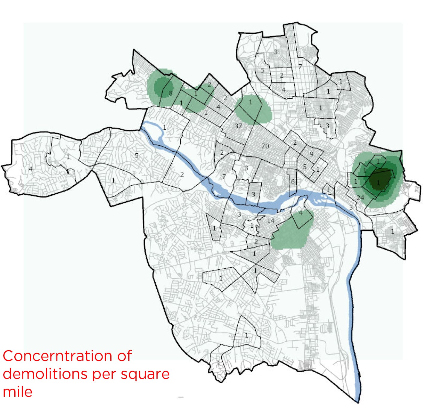 Even prior to the code refresh, some of those trends are already evident in parts of the city where developers are snapping up lots and remaking them as duplexes, denser groups of single family homes or multifamily buildings. Demolitions have been particularly common in the East End, according to mapping by the Planning Department.