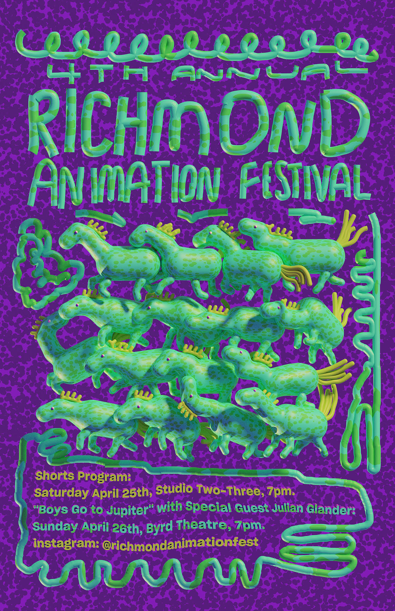 For the first time, this year’s animation festival will be held across two days: the animated shorts will screen at Studio Two Three on April 25, and the feature-length film, Boys Go to Jupiter by renowned filmmaker Julian Glander, will screen at the Byrd on April 26. The screening at the Byrd will be followed by a live Q&A with Glander himself, who will be in attendance. Both screenings begin at 7 p.m.