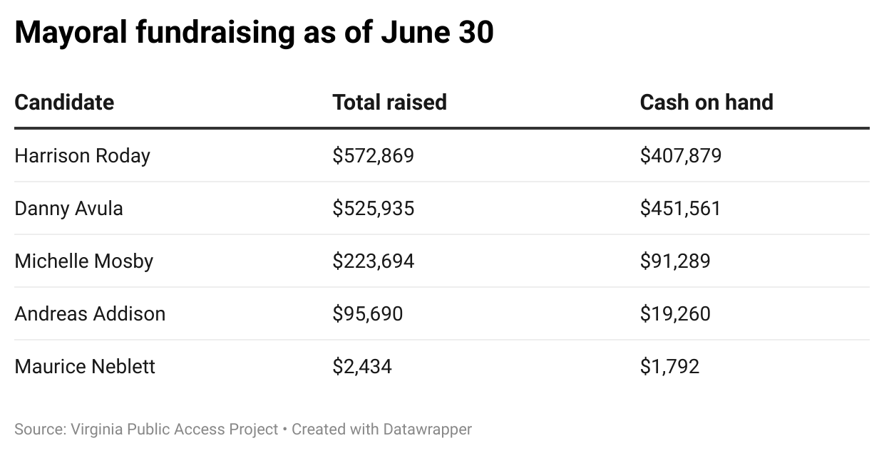 The biggest wild card among the mayoral contenders might be Roday, a 33-year-old Henrico County native making his first political run after working for a manufacturing-focused private equity firm in New York. Helped partly by his business and finance connections, Roday had raised more money than all his competitors as of the end of June.