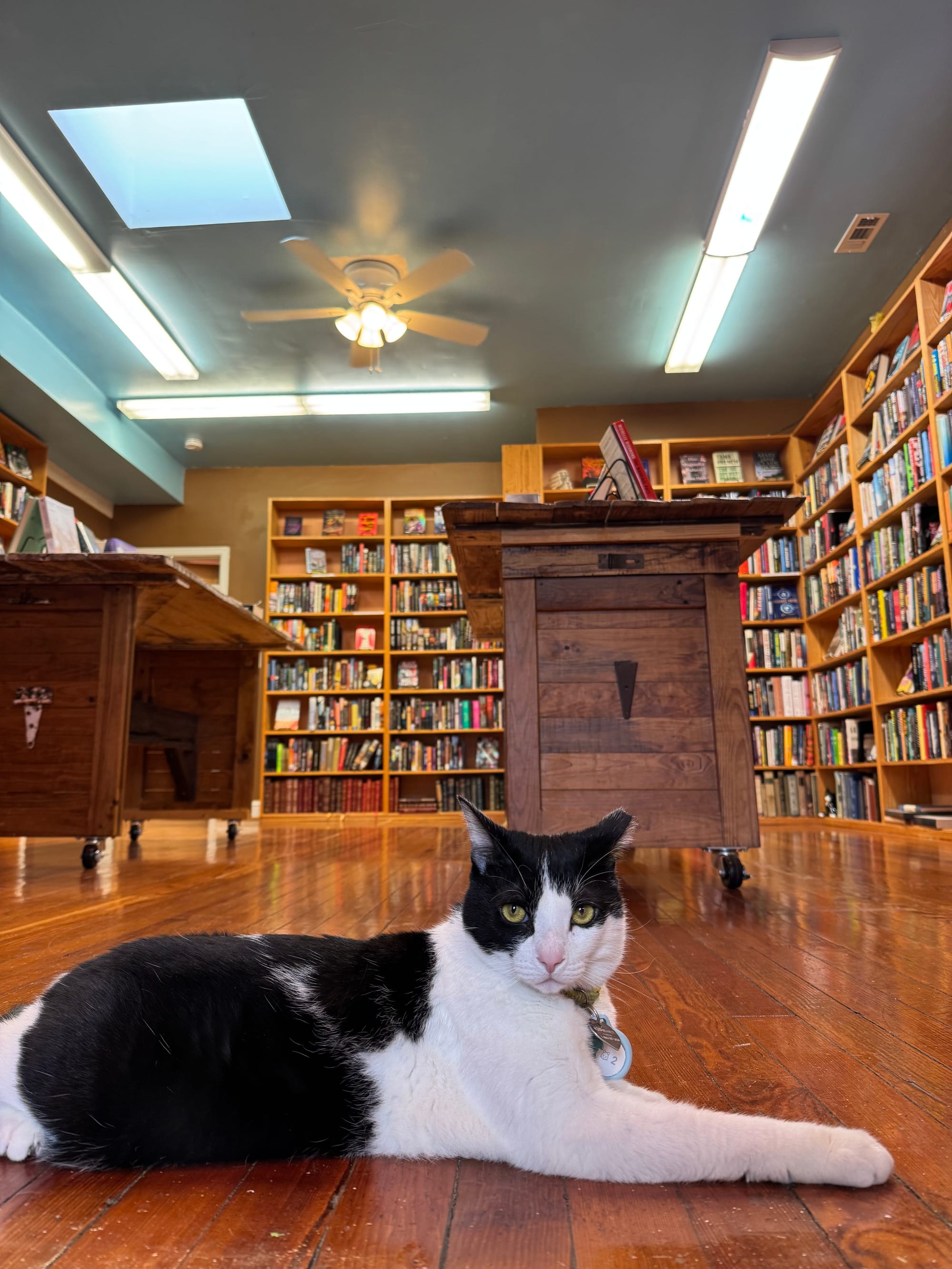 Page and Mylar took their jobs after apprenticing under WonTon, the longtime shop cat of Chop Suey Books. WonTon worked at Chop Suey’s two locations for a decade and a half before retiring in early 2023; he passed away later that year. After a change in ownership, Chop Suey rebranded as Shelf Life in early 2023. Neda Massalha, Shelf Life’s used book manager, says Page is the feistier of the shop’s two remaining cats.