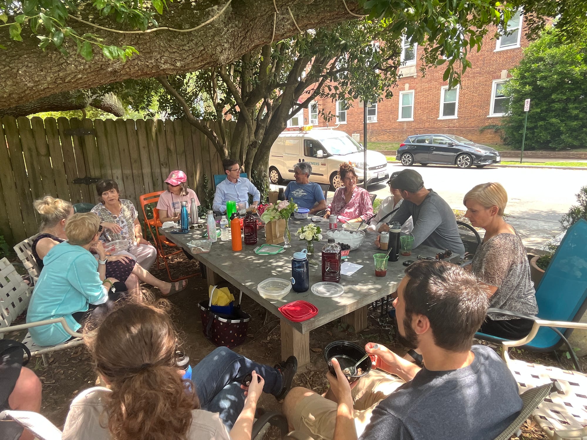 In the front lawn of a cream colored house on the corner of North Mulberry and Grove sits a big cement table with a sign: “Fridays at the Table: All welcome, noon-ish / byo lunch.”