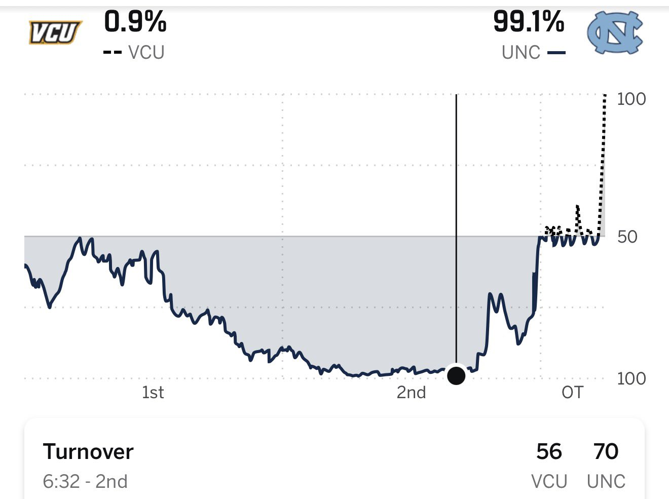With less than 7 minutes remaining in Thursday night's game, VCU trailed favored North Carolina by 14 points, and things looked bleak. By one metric, they had less than a 1% chance of winning the game. Then...