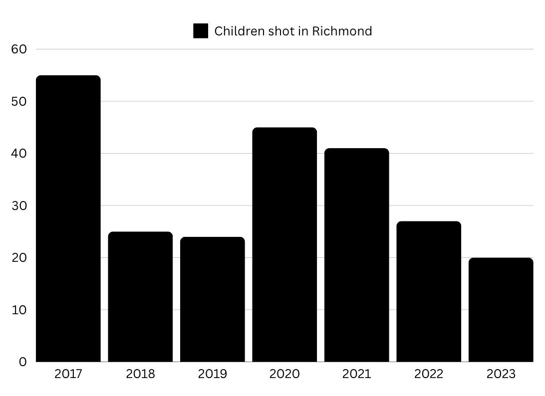 Data provided by the Richmond Police Department show the number of children shot annually has fluctuated widely over the past eight years. A 2017 peak of 55 was immediately followed by a sharp drop to 25 in 2018 and 24 in 2019, which was then succeeded by another increase.