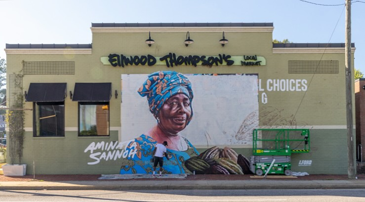 Artist Jason Ford painted this mural, which was unveiled Saturday at Fairtrade Fest. The mural depicts Sierra Leone cocoa farmer Aminata Sannoh, whose cocoa is used in the Hu Kitchen chocolate sold at Ellwood Thompson’s.