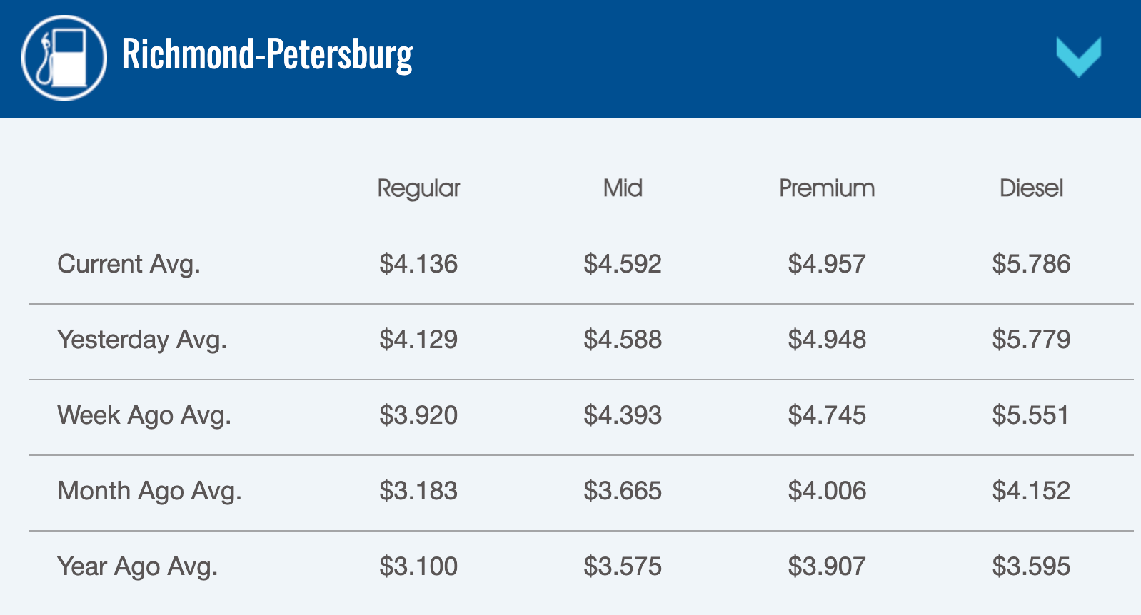 The national average for regular gasoline has only hit $5 once, on June 11, 2022, amid Russia's invasion of Ukraine. In Richmond, the average has never reached $5 per gallon.