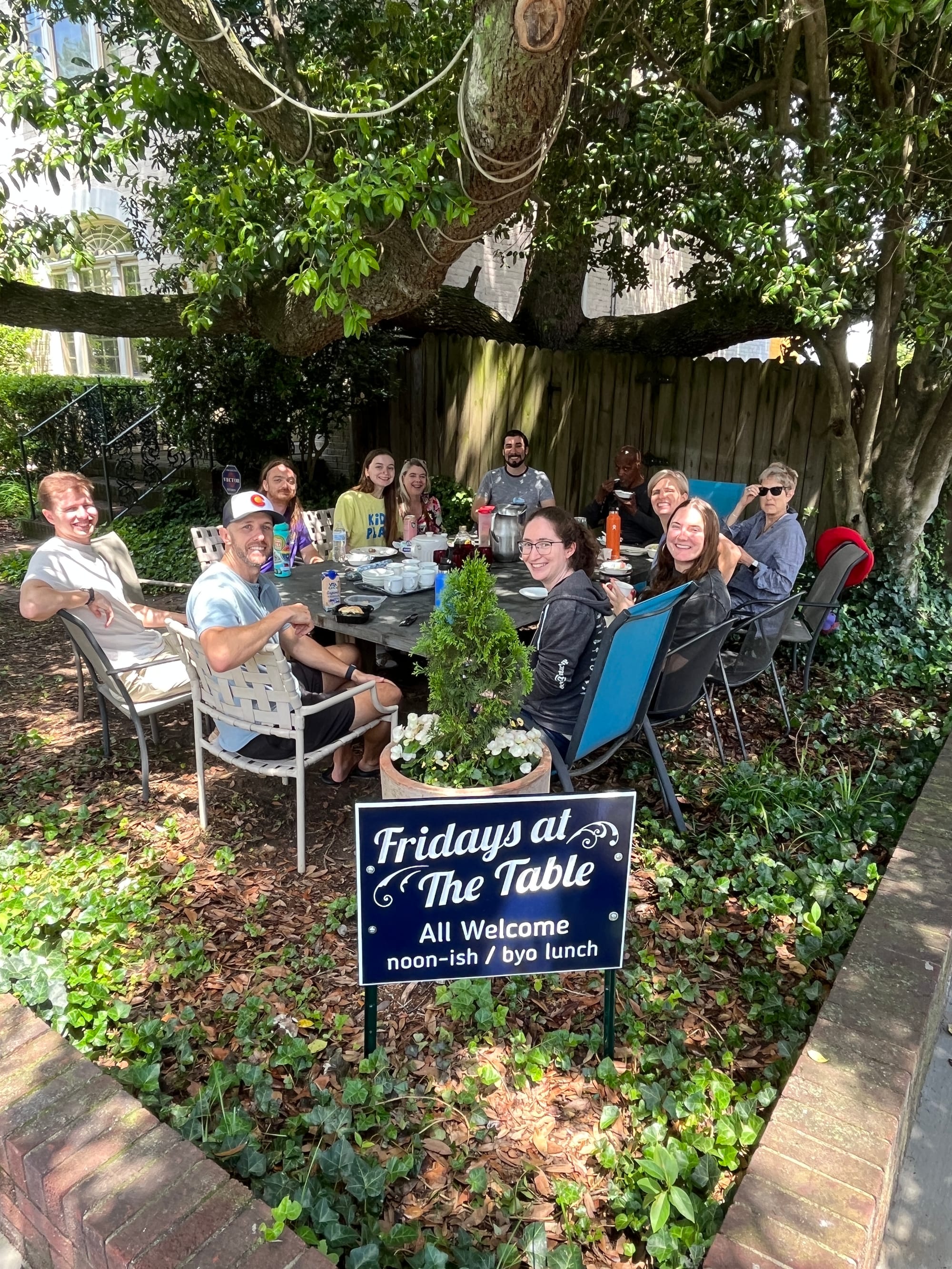In the front lawn of a cream colored house on the corner of North Mulberry and Grove sits a big blue stone table with at least ten chairs perched around. In front of it stands a sign: “Fridays at the Table” in big swirling font at the top, “All welcome, noon-ish / byo lunch” it reads beneath.