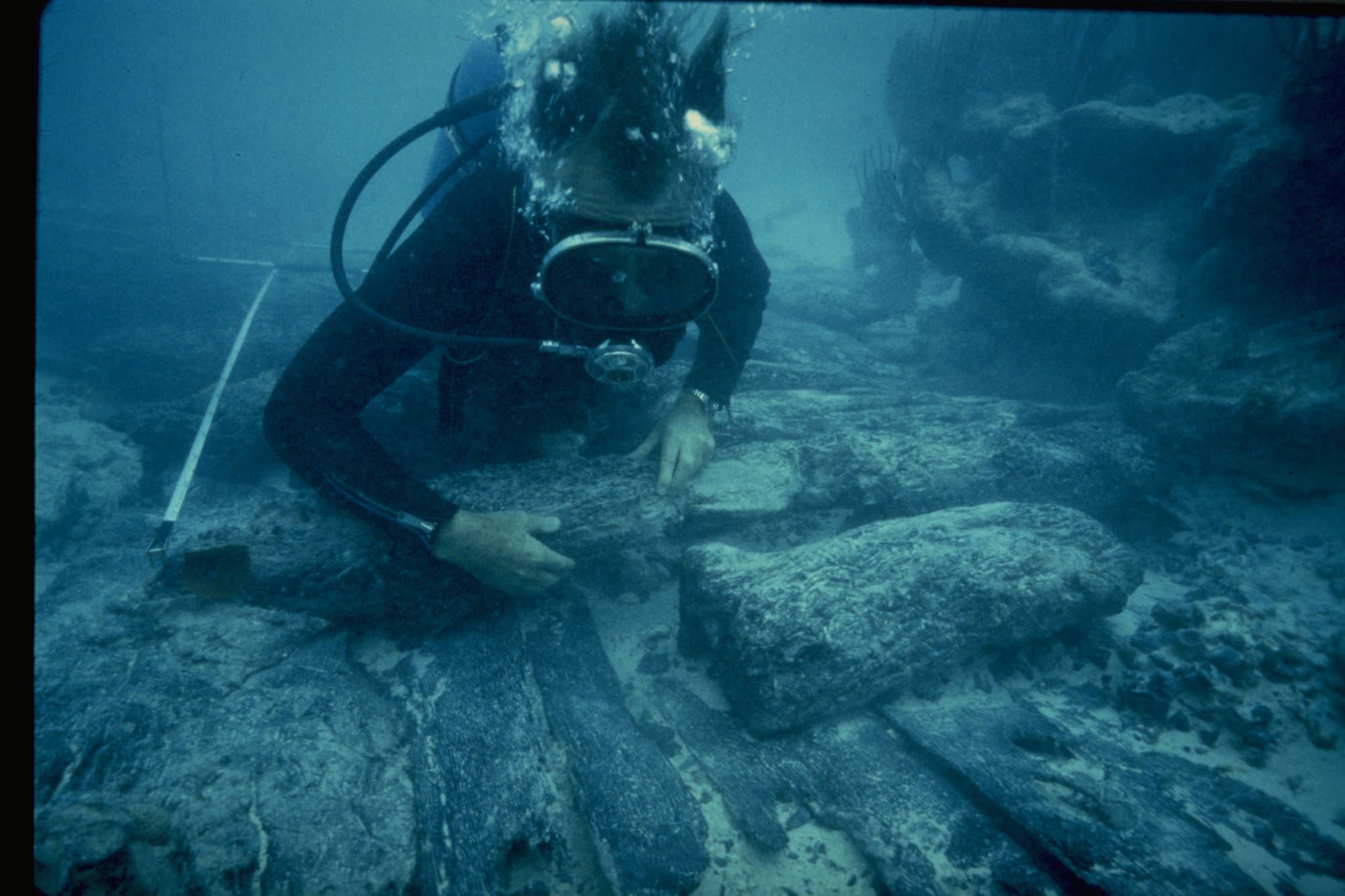 Employed at the U.S. Naval Operating Base in Southampton, Downing began devoting his spare time to the search. Using a converted utility boat, Downing and another man began scouring the reefs off Bermuda’s St. George’s Island. On Oct. 18 of that year, the two discovered the remains of the wreck; identification of objects found at the site was conducted with the assistance of archaeologist Ivor Noël Hume and his wife Audrey at Colonial Williamsburg.