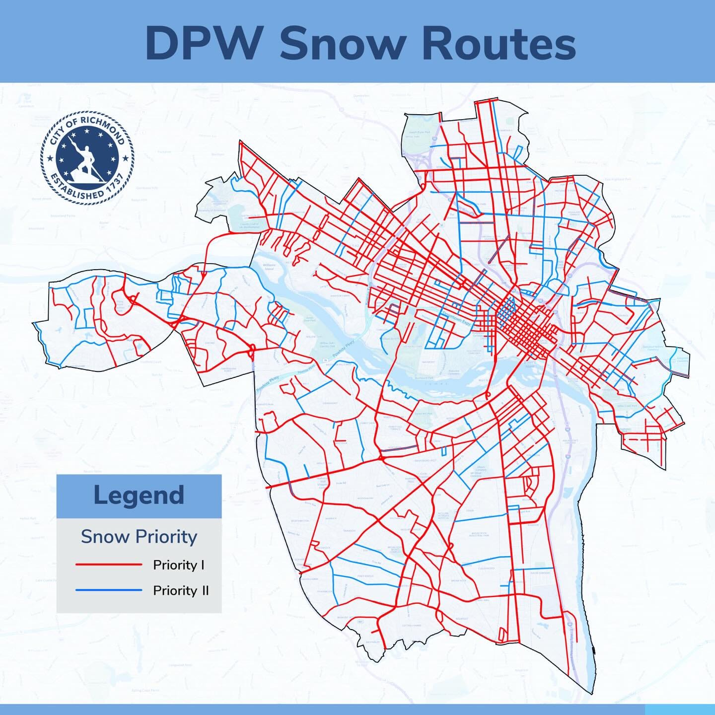 Richmond and Henrico released maps showing the priority routes they plowed, which should be largely clear for motorists.