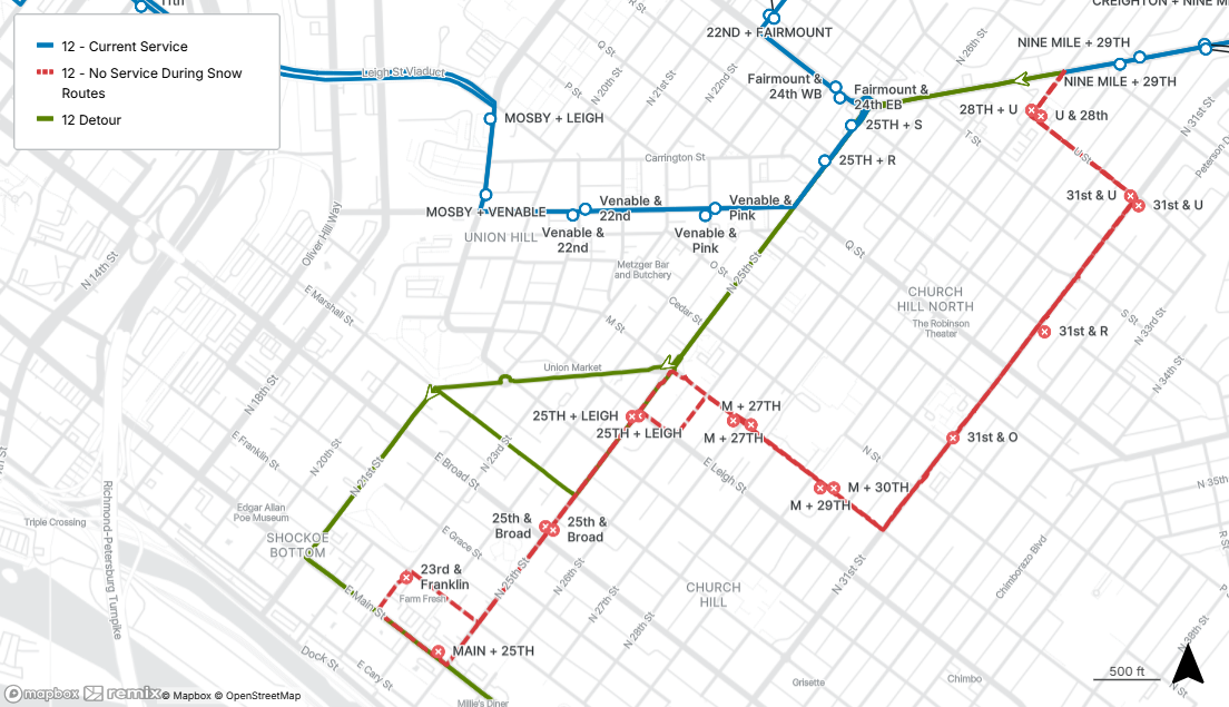 That includes buses having to take “snow routes” – an alternative route of the regular paths – to avoid hazardous streets that have historically proven to be difficult to navigate in inclement weather. That means that drivers may not reach all the stops in the regular route. The company also notes that additional detours may take place depending on conditions.