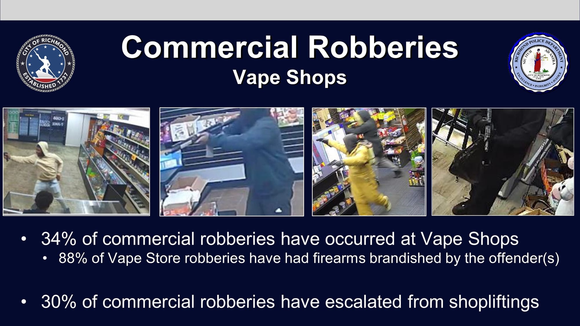 Commercial robberies are also up 14% so far in 2025, and police say a little more than a third involve vape shops that have rapidly spread throughout the city.