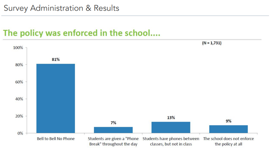 The goal of the law is to keep students engaged in class, which Parks said is happening in schools, according to a survey taken primarily by about 1,700 students. But the same survey also showed that the cell phone ban is not being enforced uniformly across all schools in the division.