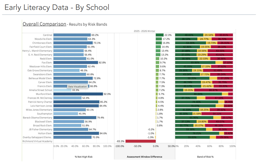 K-2 students who are not at high risk for developing reading issues increased by nearly 5% across Richmond’s elementary schools. The gains were also seen among specific subgroups, with economically disadvantaged students reporting a 6% increase, English learners showing a nearly 7% increase and a 10% increase among students with disabilities.