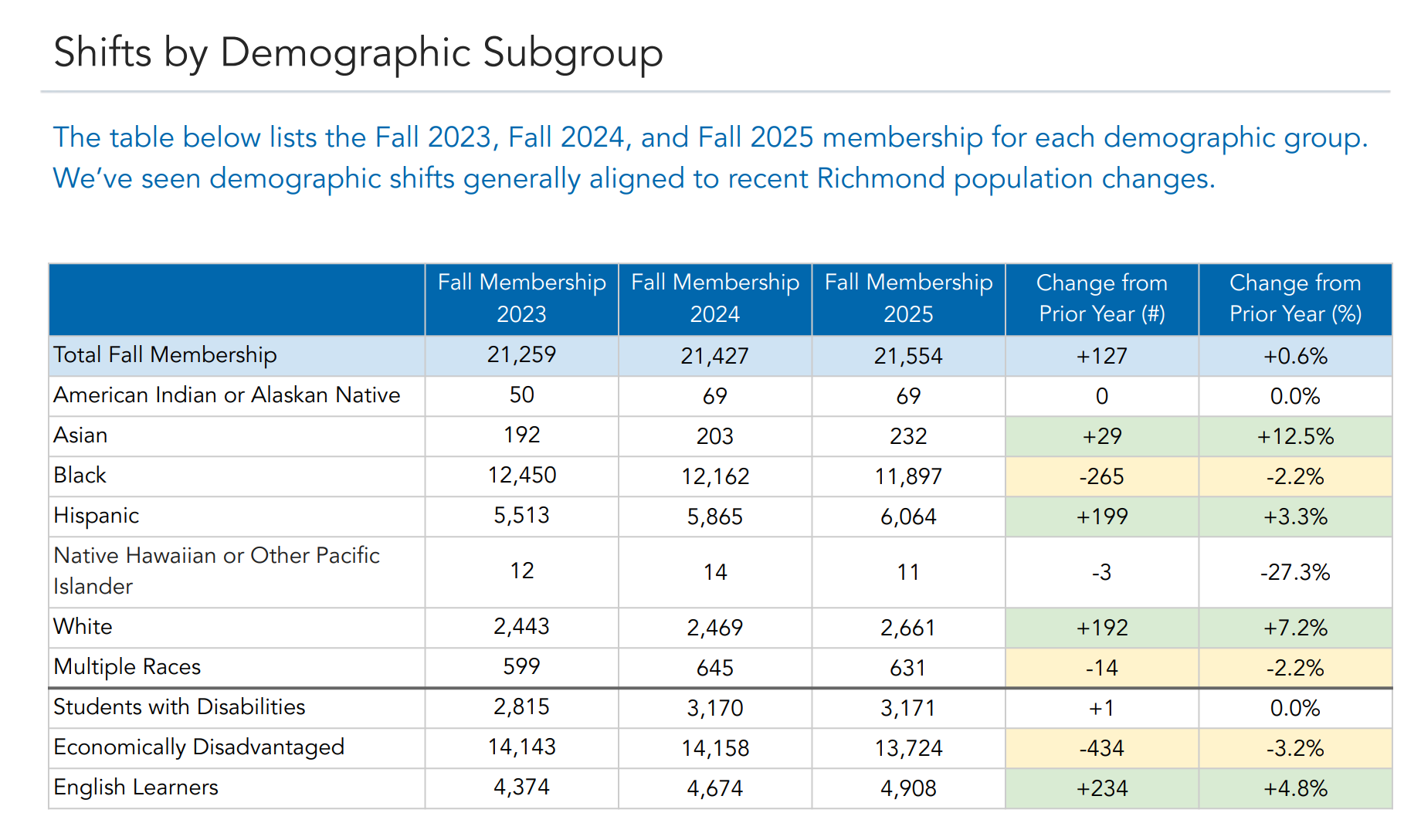 The trends follow the population coming in and out of the city as seen in U.S. Census data, Hostetter said. Although population numbers for 2024 and 2025 are not available, the decline among Black residents and rise in white residents in Richmond is evident, beginning shortly after the COVID-19 pandemic.