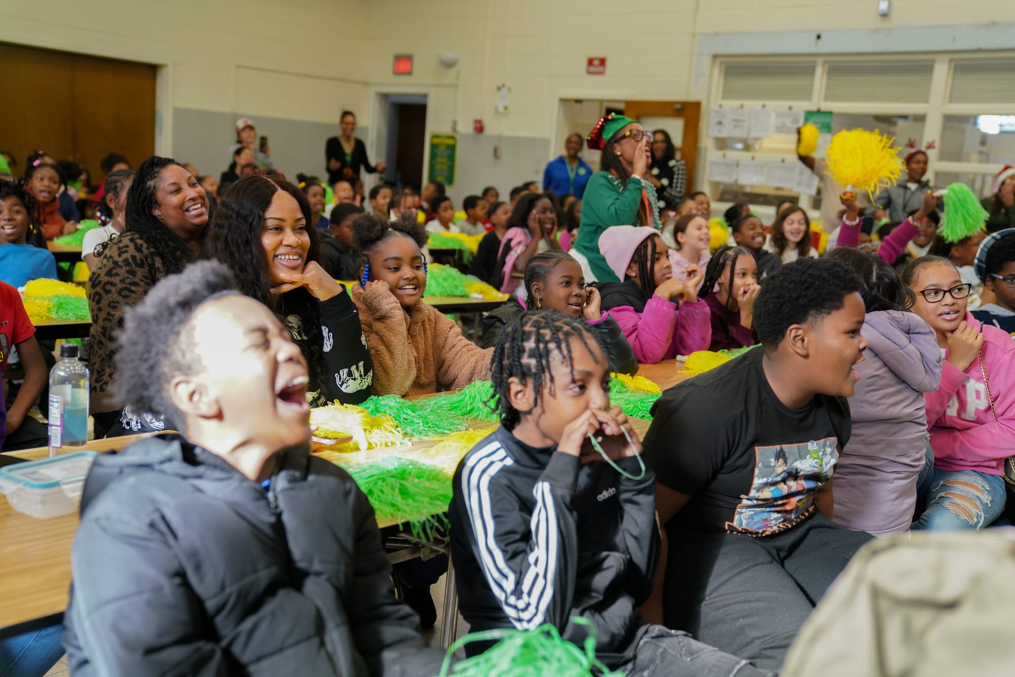 “Go Ms. Sneed! Go Ms. Sneed!” chanted a crowd of hundreds of giddy students, waving green and yellow pom-poms – the school’s colors – as she walked into the fully packed cafeteria.