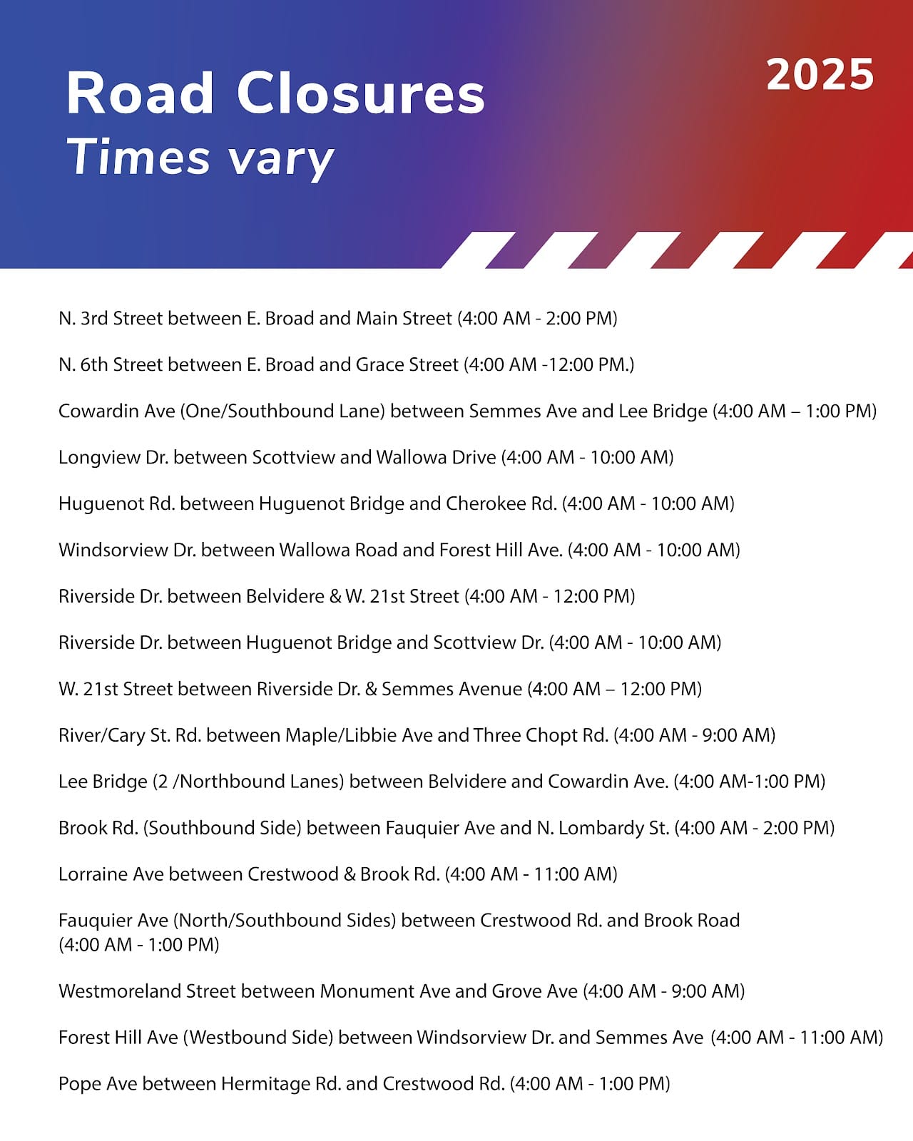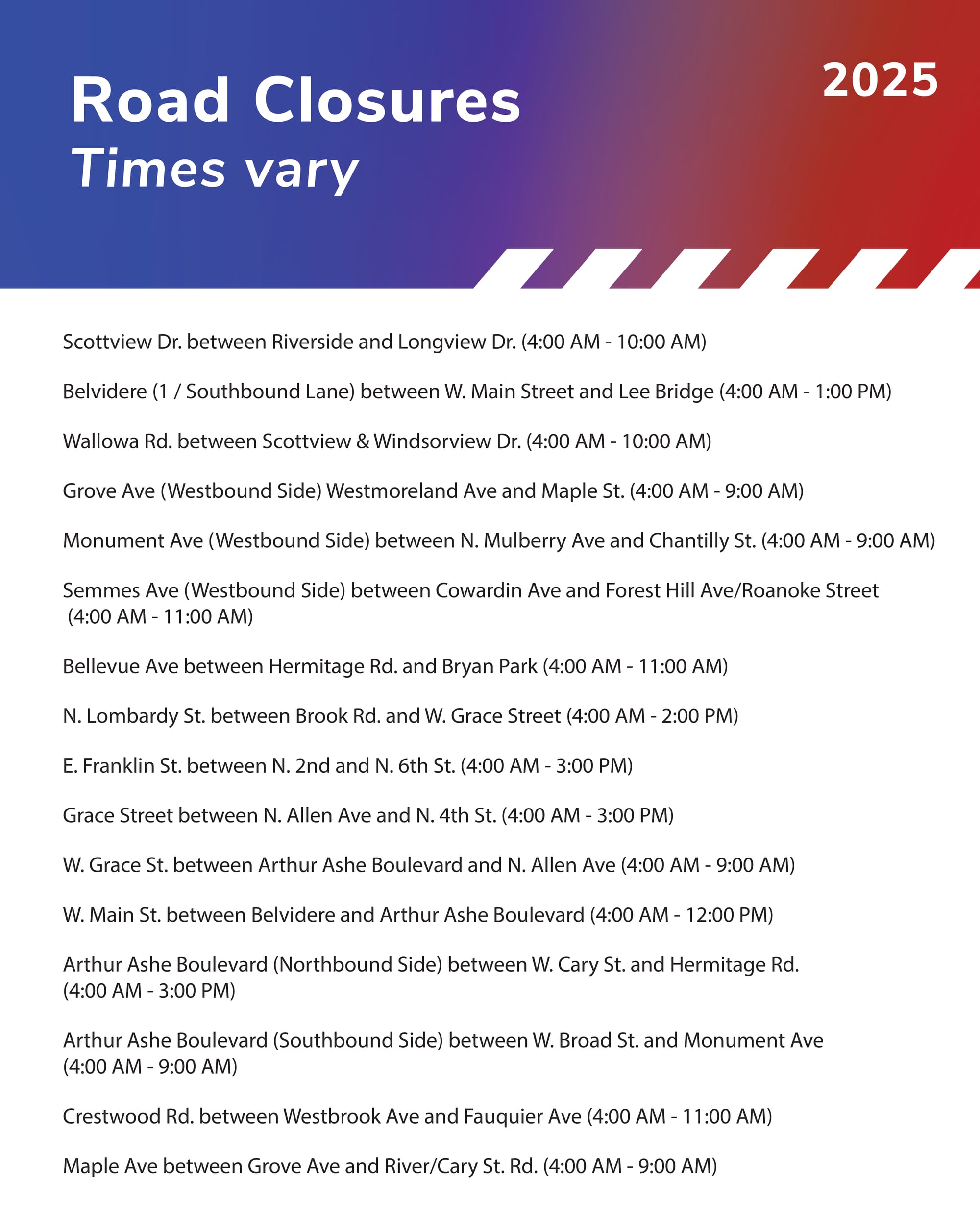 Broad Street will be closed from Arthur Ashe Boulevard to N. 10th street until 10 a.m., and Hermitage Road will be closed northbound between Laburnum and Pope Ave. until 1 p.m.