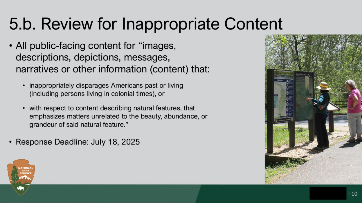 Last year, National Park Service employees all over the country were directed to report any public-facing content at parks that “inappropriately disparages Americans past or living (including persons living in colonial times).”