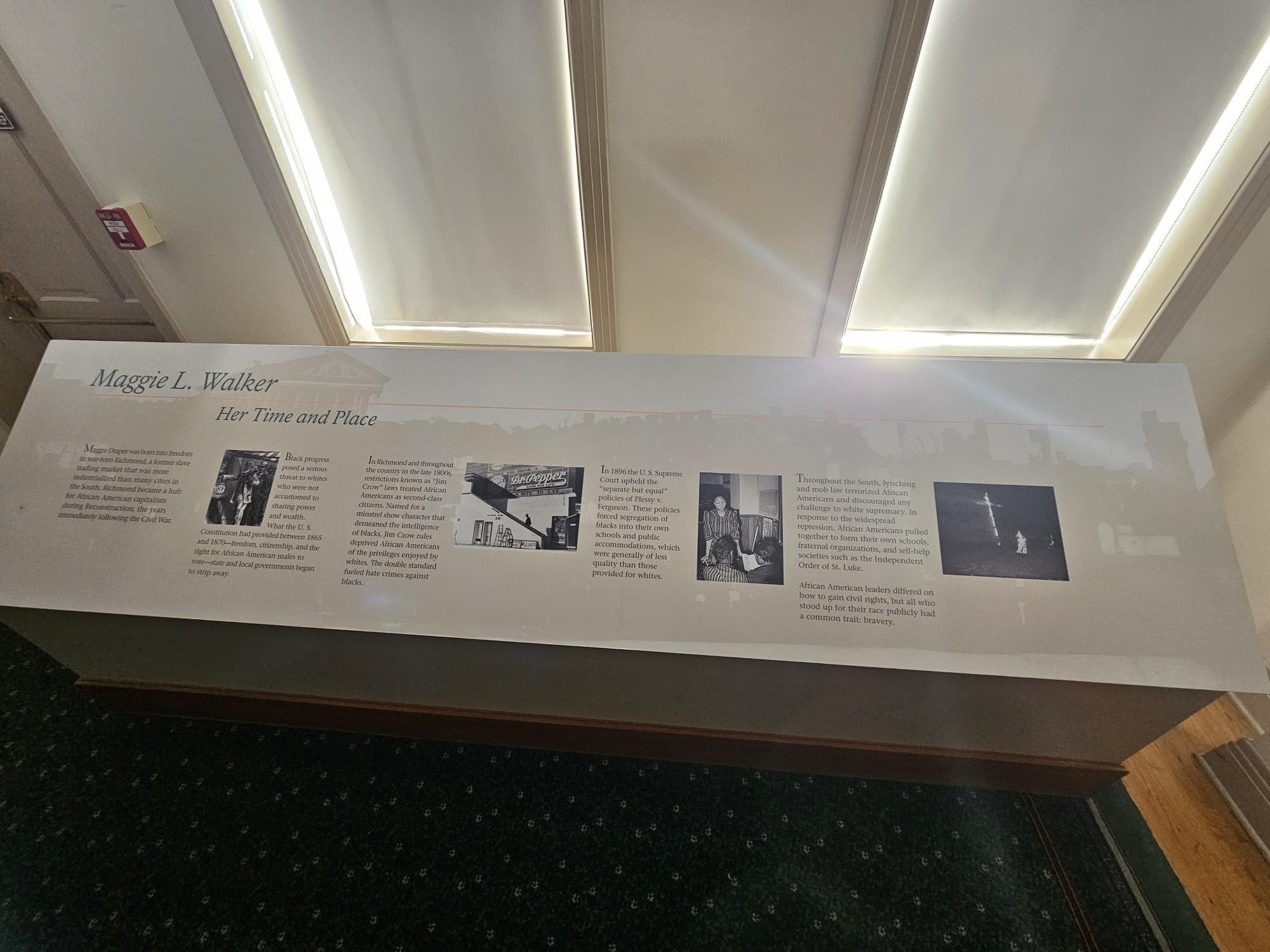 Signage flagged at the historic home of Richmond native Maggie Walker, the first Black woman in the United States to found a bank, contains information about government-enforced segregation during her time.