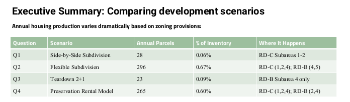 The RKG analysis looked at four different scenarios that could affect the roughly 44,000 parcels in the city that would be zoned for residential detached homes under the code refresh.