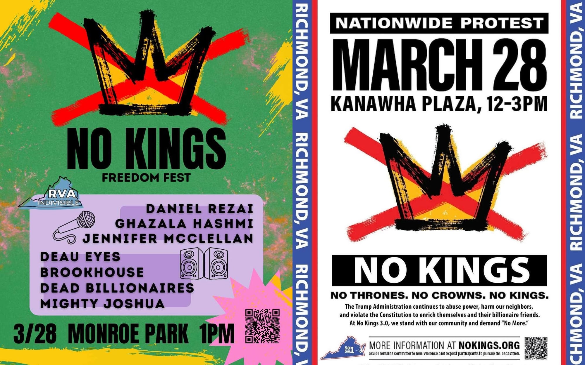 The third edition of a national protest dubbed “No Kings” will take place this weekend, and in Richmond, two groups will host events with that moniker less than a mile from each other.