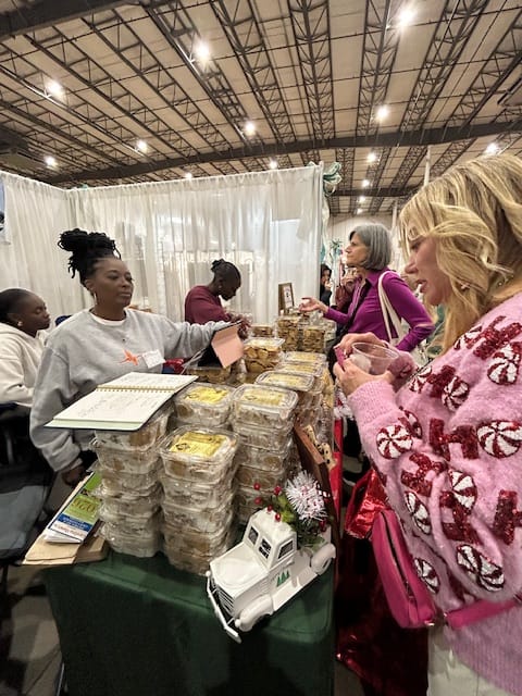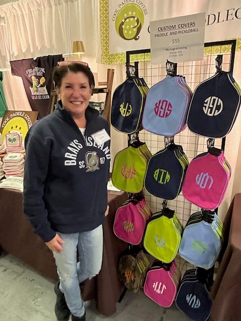 What do they hope to find? Vendors are savvy enough to know the answer – gifts at prices that hit a sweet spot between not too expensive and not too cheap. Lots of items – like the piles of coffeecakes – are one size fits all. Some are shopping for a particular person, and there’s a big selection of personalized items from laser cut ornaments to monogrammed pickleball racket covers. As always, there are plenty of Santa sweatshirts, hats, dips, totes, baby things, ornaments, foods for dogs and people, earrings and the ubiquitous bath bombs. Prices range from a few dollars to hundreds.