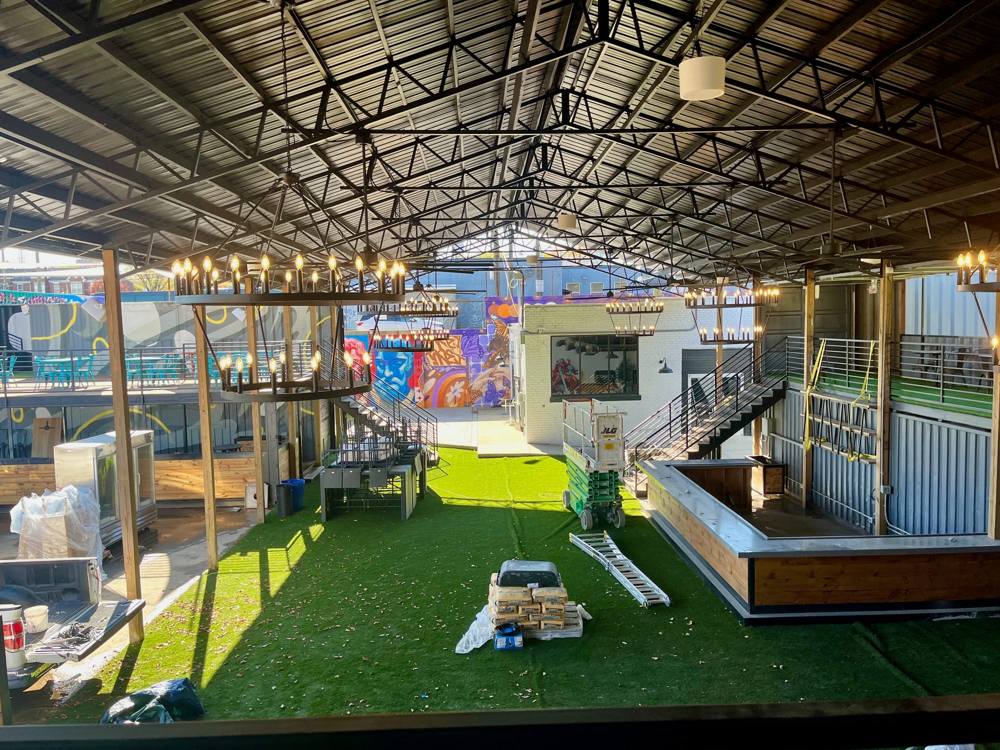 The space is two levels in spots, with one high balcony Garner is calling the VIP space. It sports a huge fireplace and overlooks a common area. String lights crisscross the high ceilings. Below the VIP spot it opens up onto an the pavilion area, where the winter wonderland ice rink and future festivals will be.